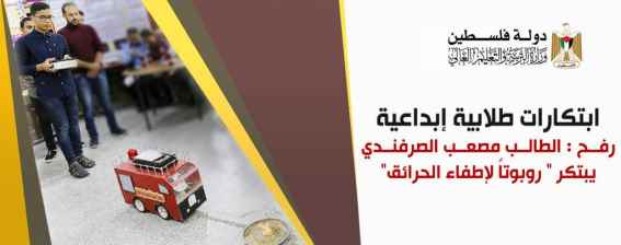 ابتكر الطالب مصعب الصرفندي من الصف العاشر بمدرسة الدوحة الثانوية للبنين بمديرية تعليم رفح “جهاز روبوت لإطفاء الحرائق” بمساعدة الطالب إسماعيل عمر وإشراف المعلم صفوت ضهير ومدير المدرسة…