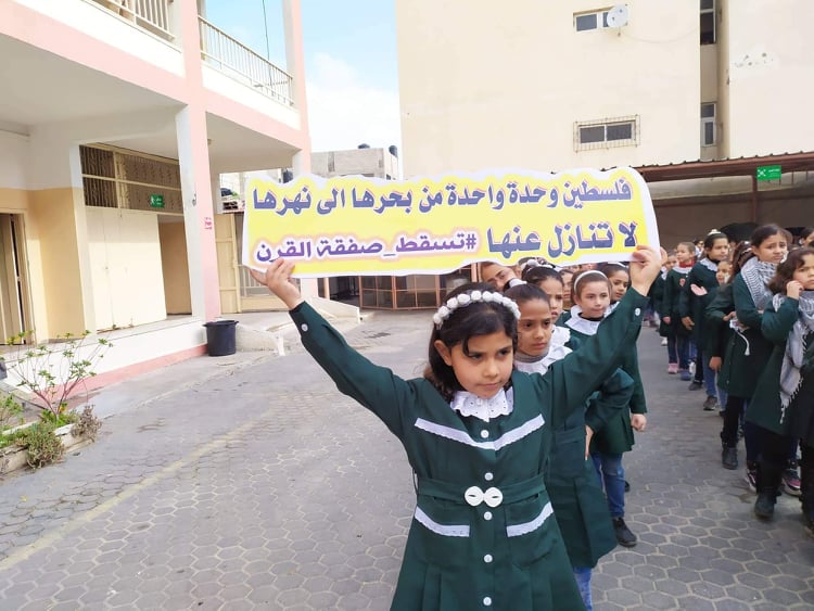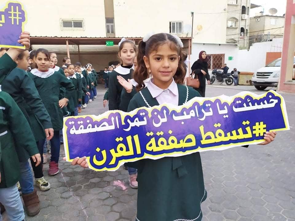 ضمن فعاليات " إستنكار صفقة القرن " قامت طالبات مدرسة هاشم الأساسية المشتركة "ب" بتجسيد خارطة فلسطين في مديرية شرق غزة .