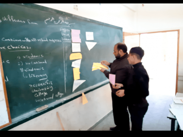 نفذ المعلم محمود أبو مصطفى حصة للصف العاشر حول academic and vocational routes مستخدما الألوان والبطاقات الملونة